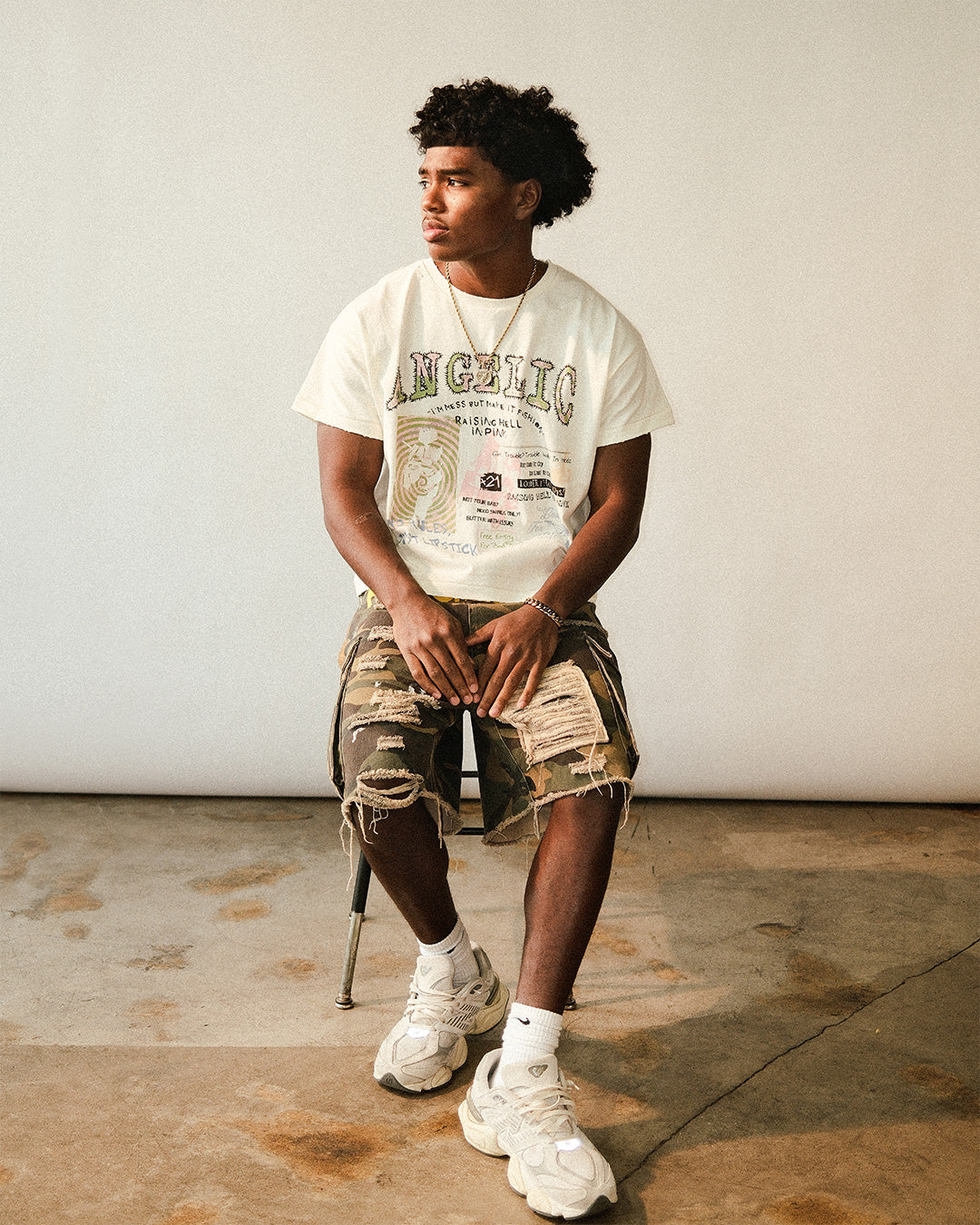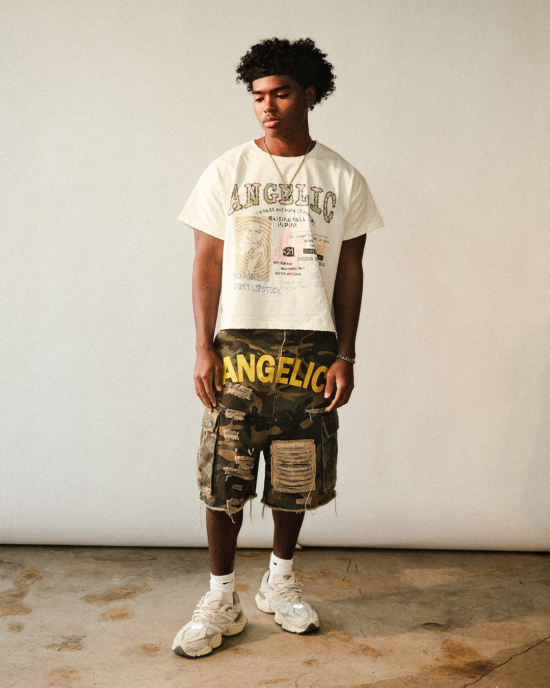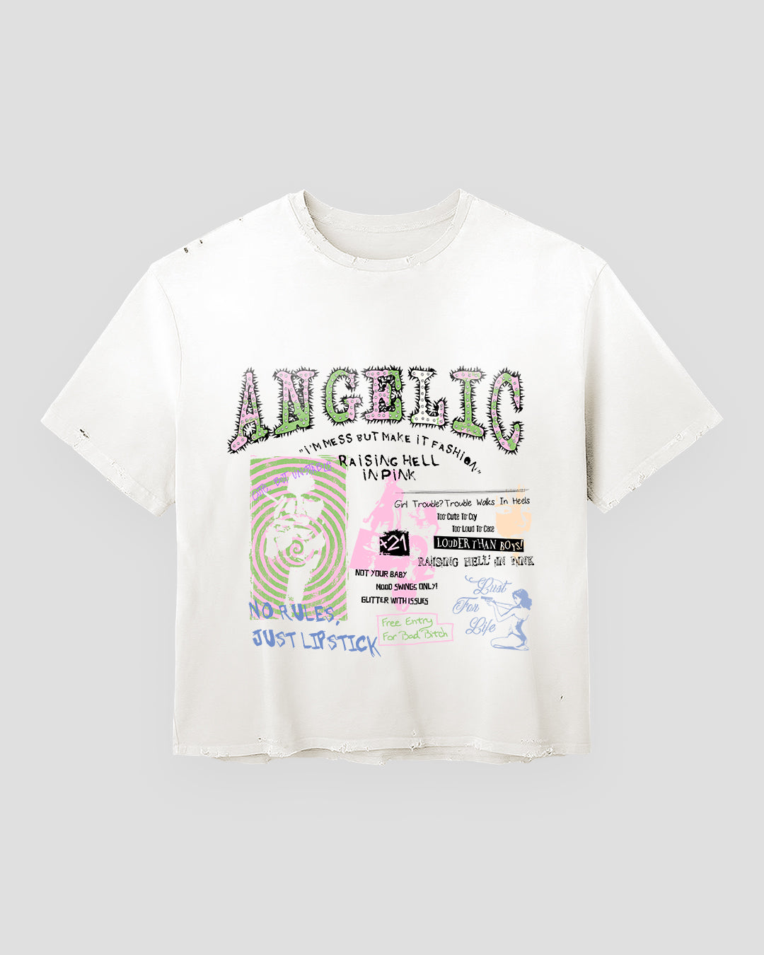 Pink Rebel flips every “not for you” sign. A torn-club-flyer collage—hand notes, lipstick scrawl, loud type—lands on a bone base, cut boxy and cropped on a true menswear block. Soft in hand, loud in the crowd; subversion, made clean.