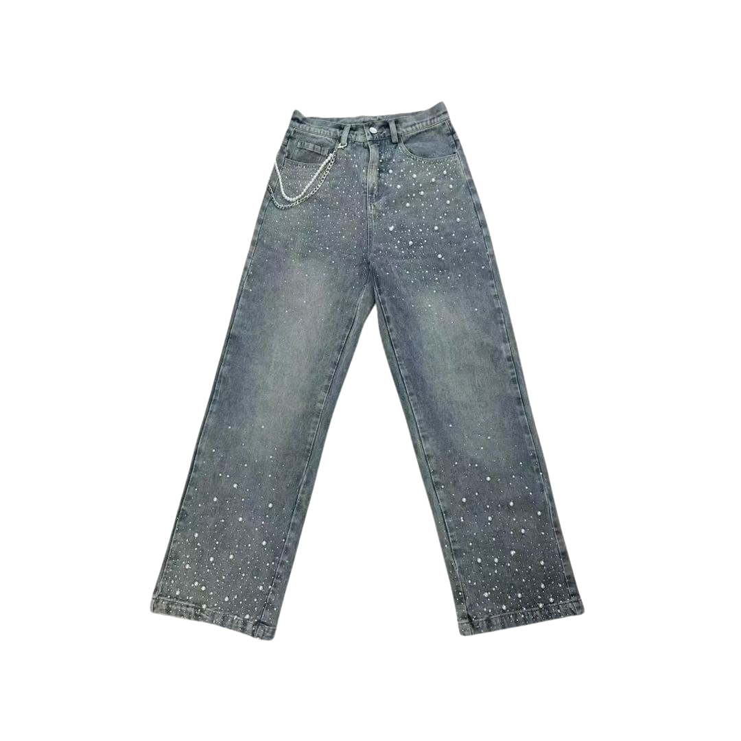 Upgrade your wardrobe with the VYBES Pearl Jeans, where bold streetwear meets elegance. Designed for those who love to stand out, these baggy-fit jeans ensure turn heads with every step while staying effortlessly comfortable.