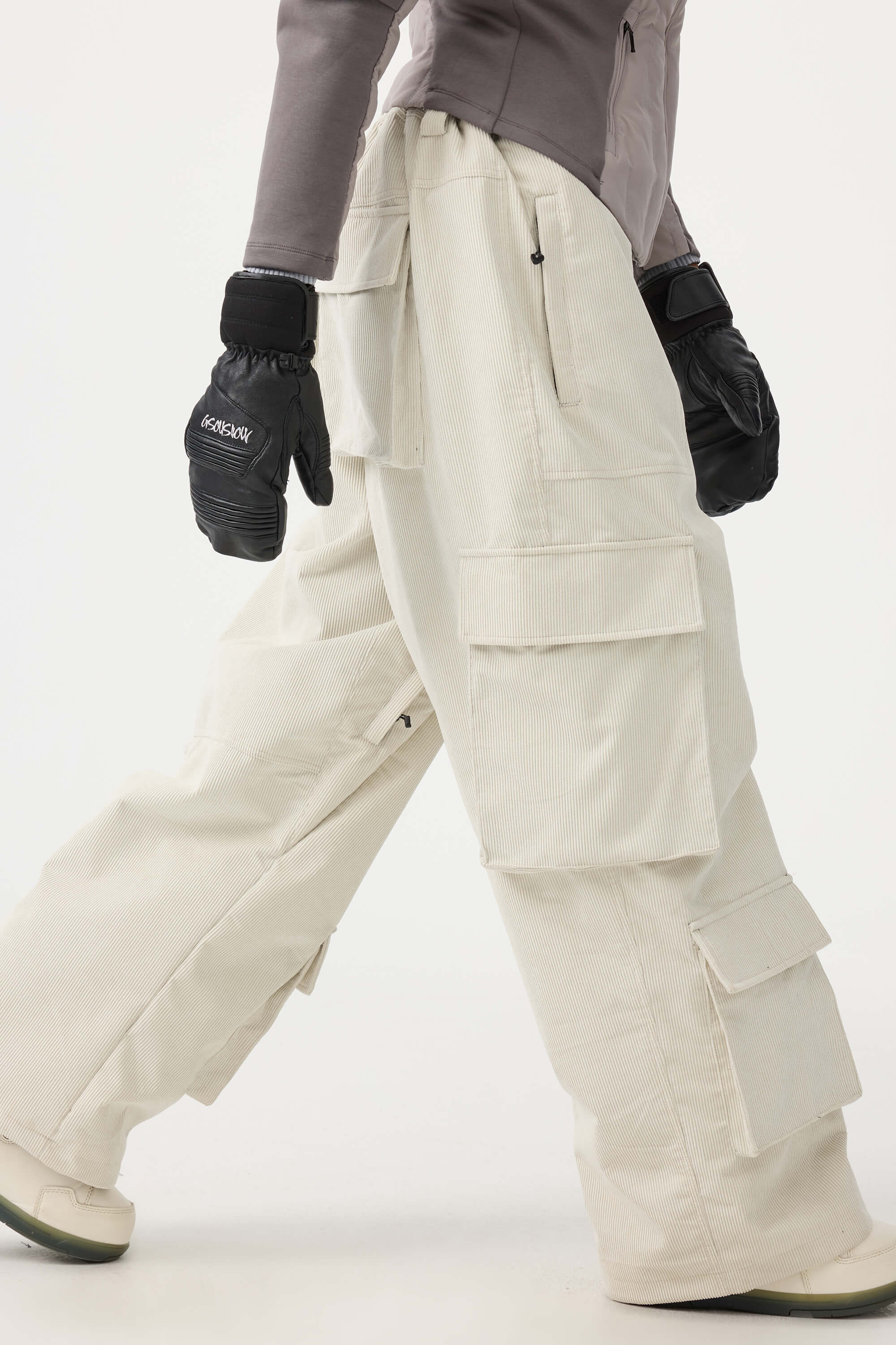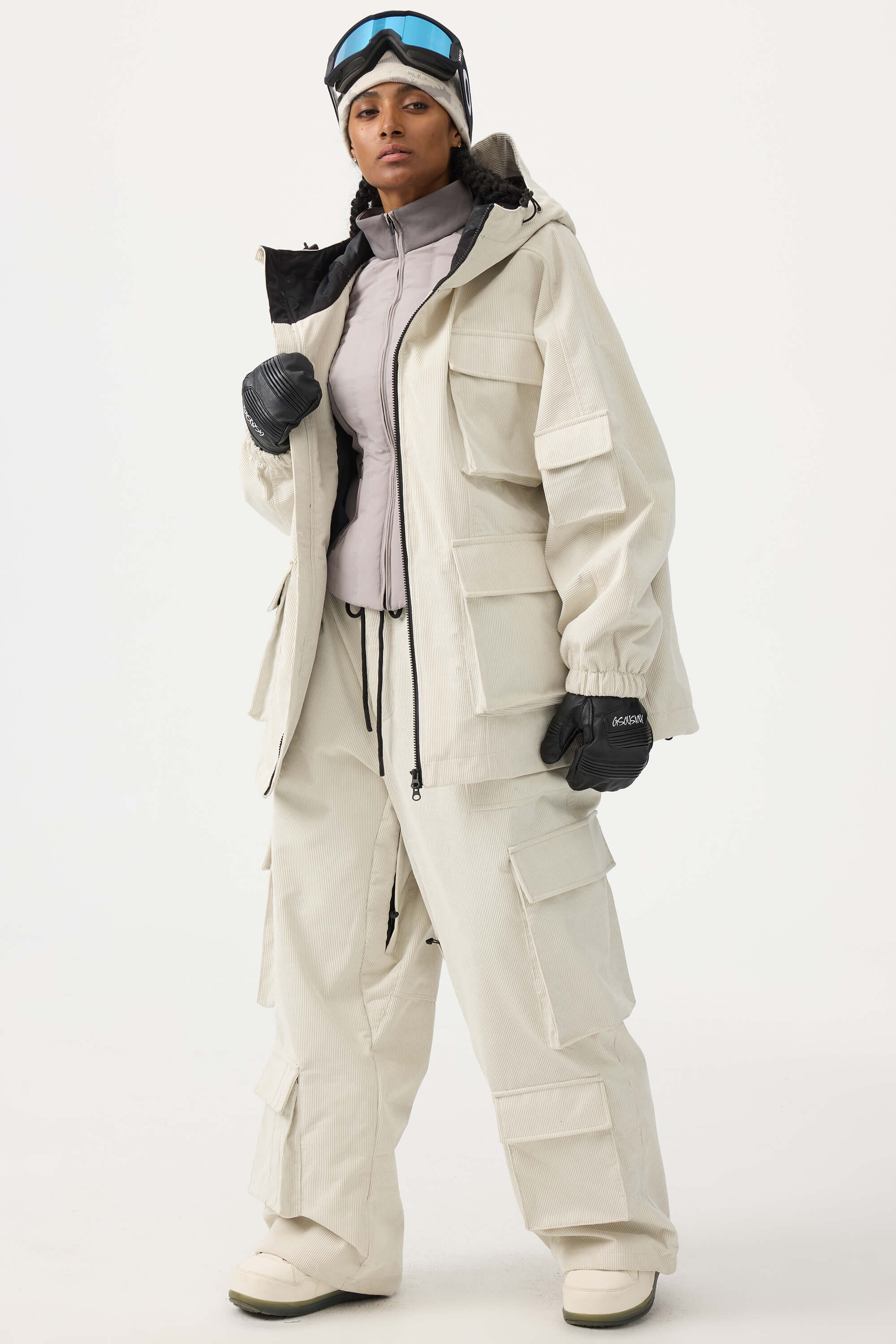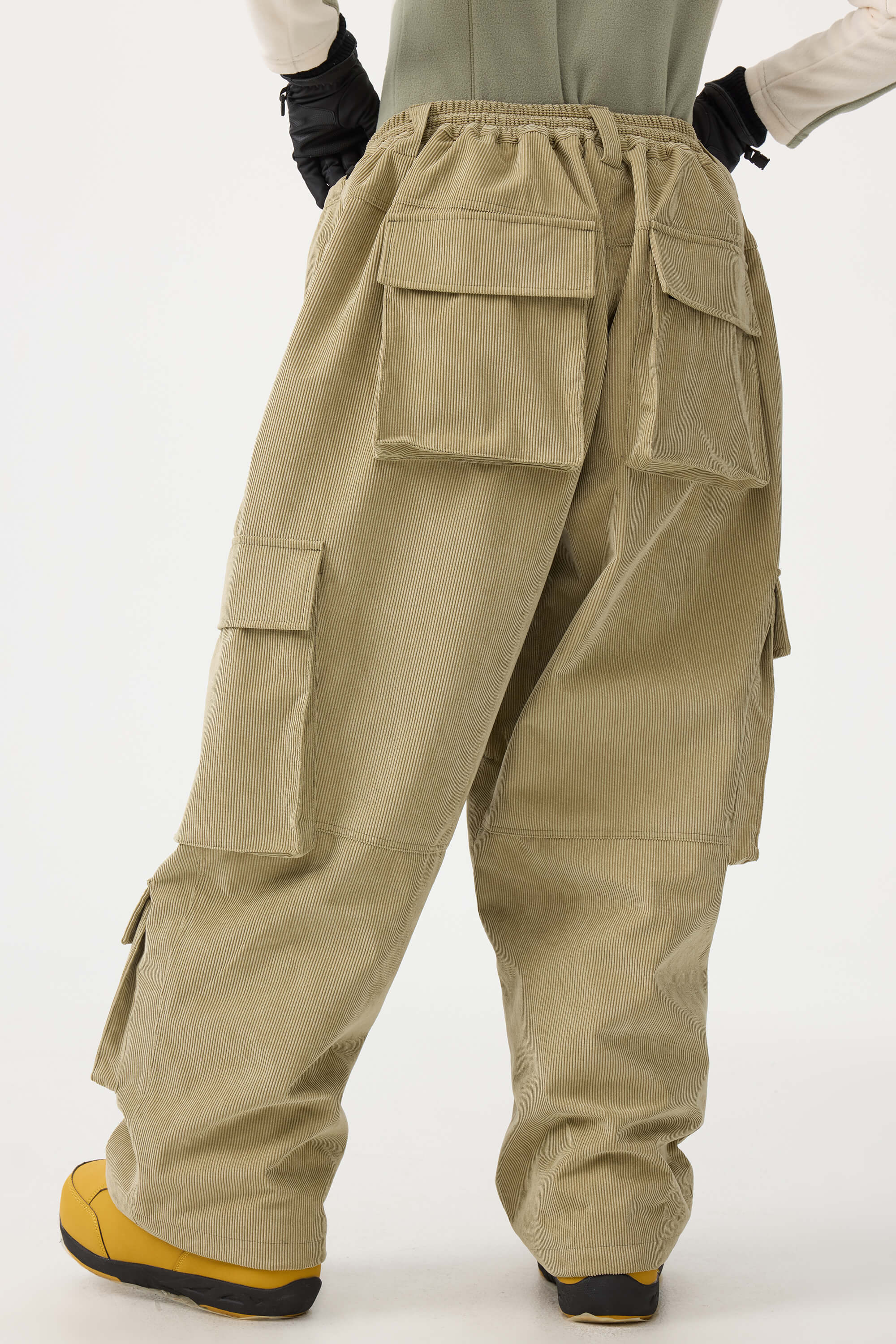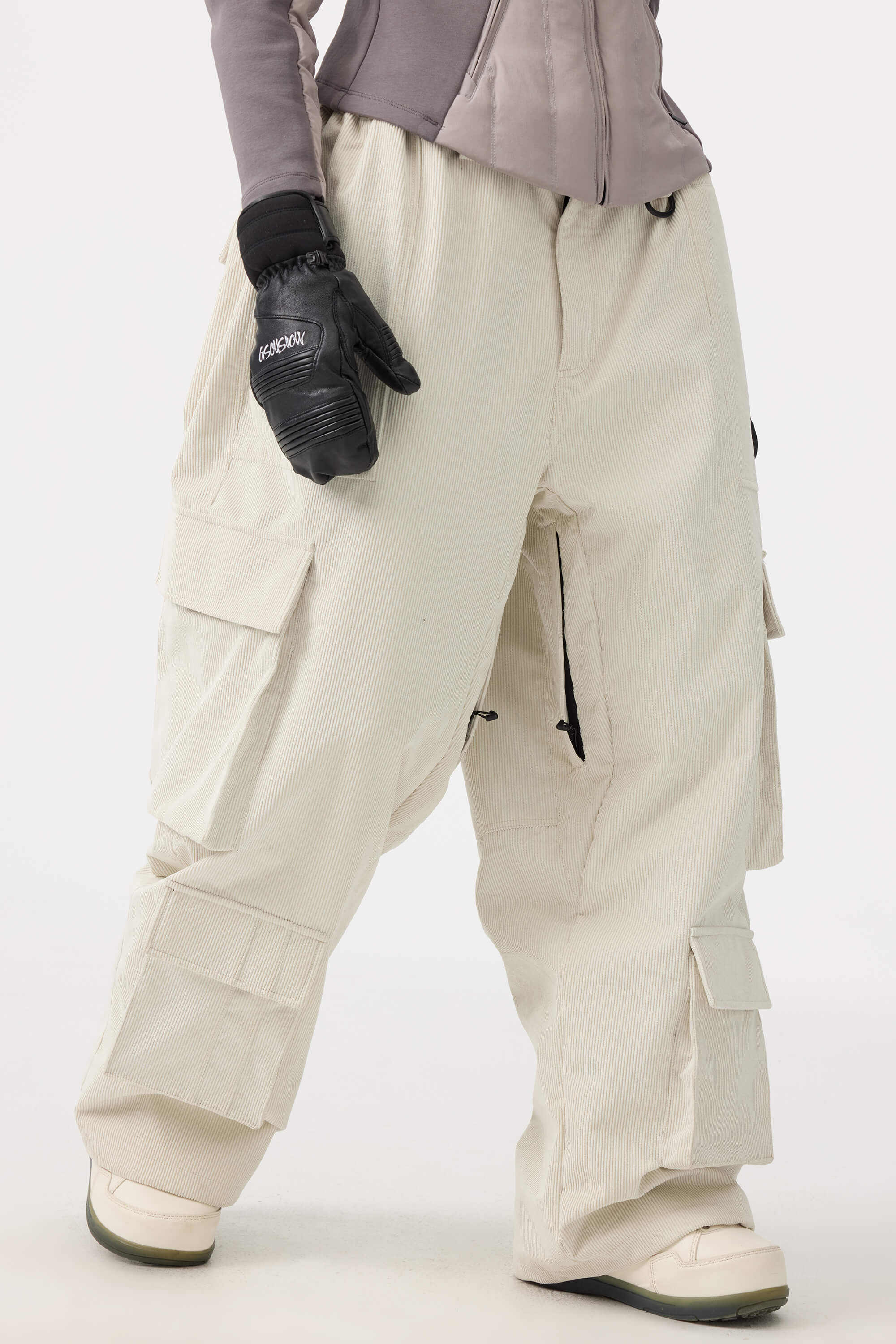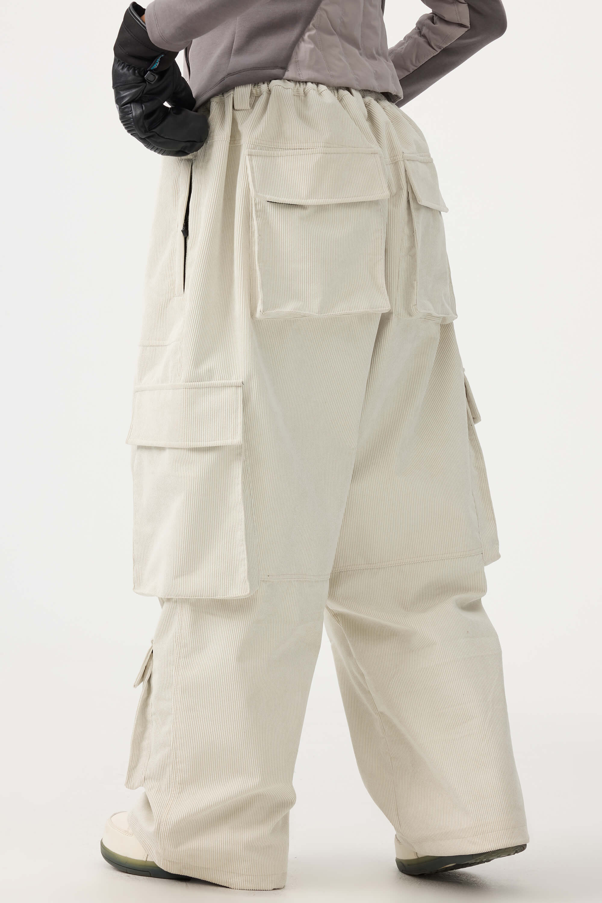 Women's Beige Baggy Multi-Pocket Corduroy Snow Pants