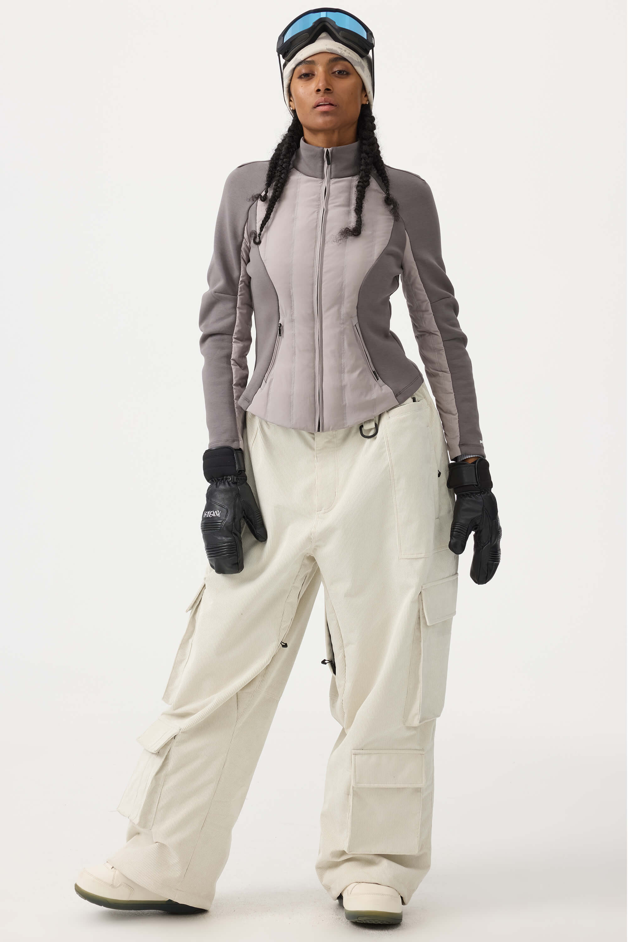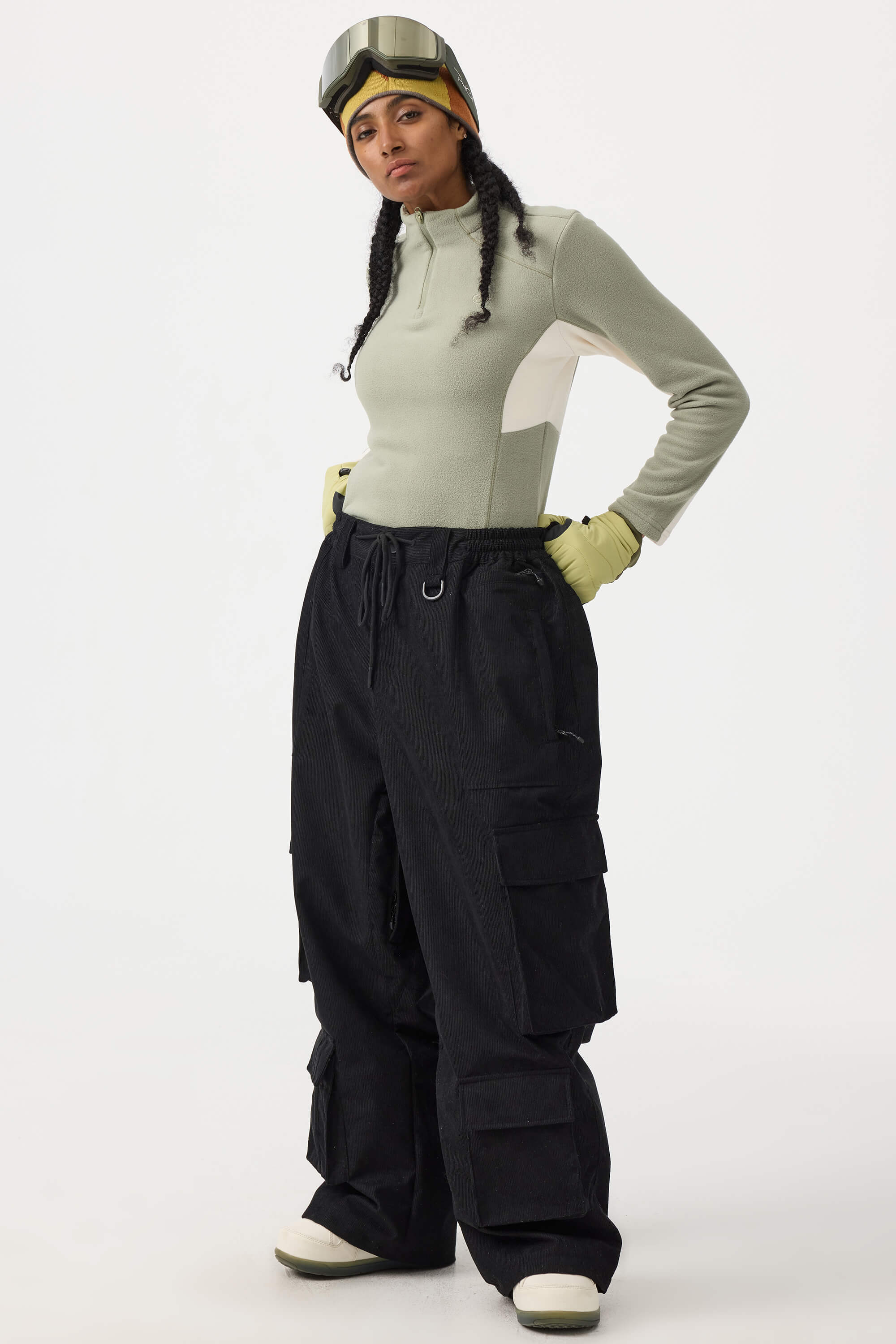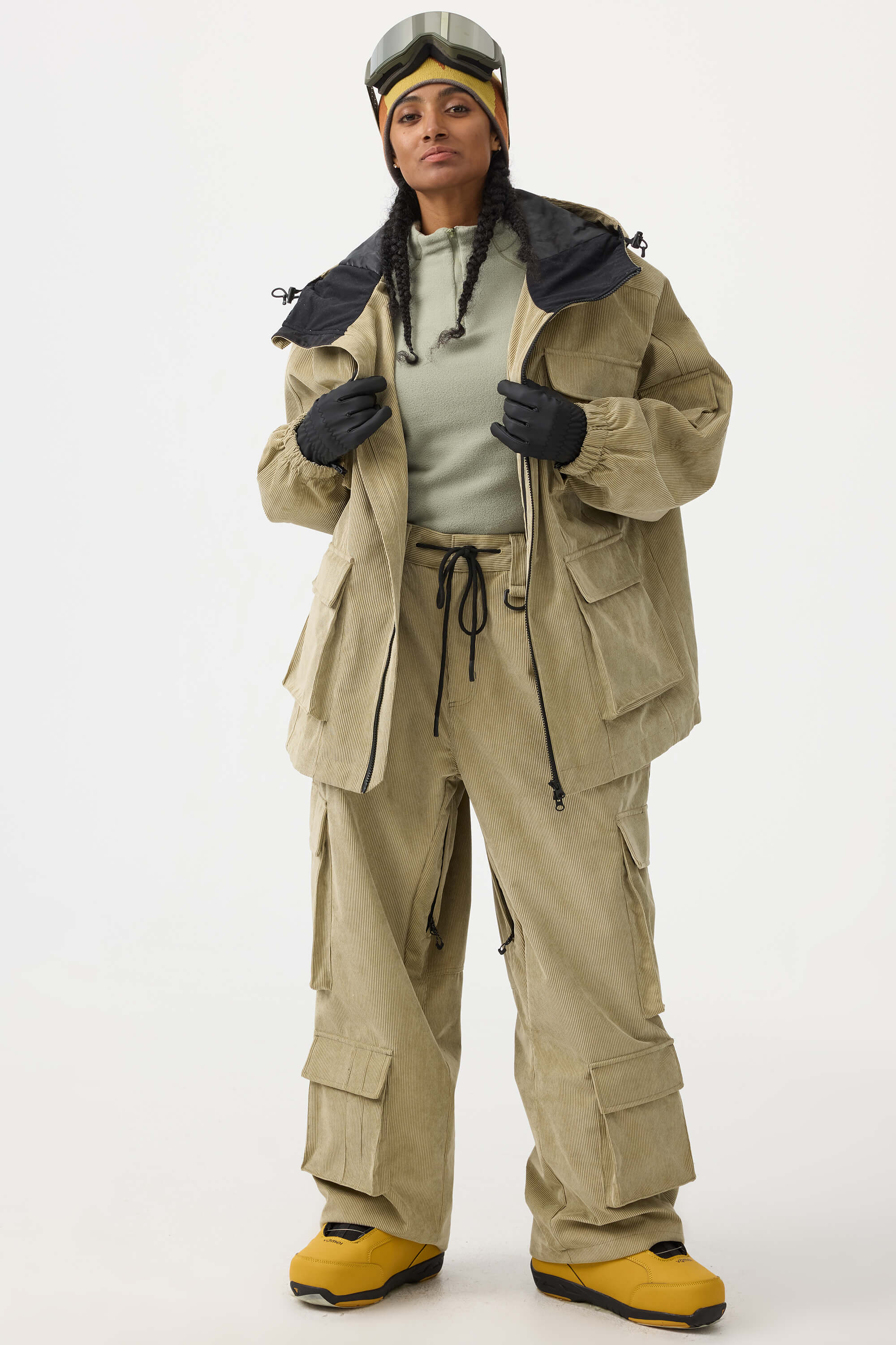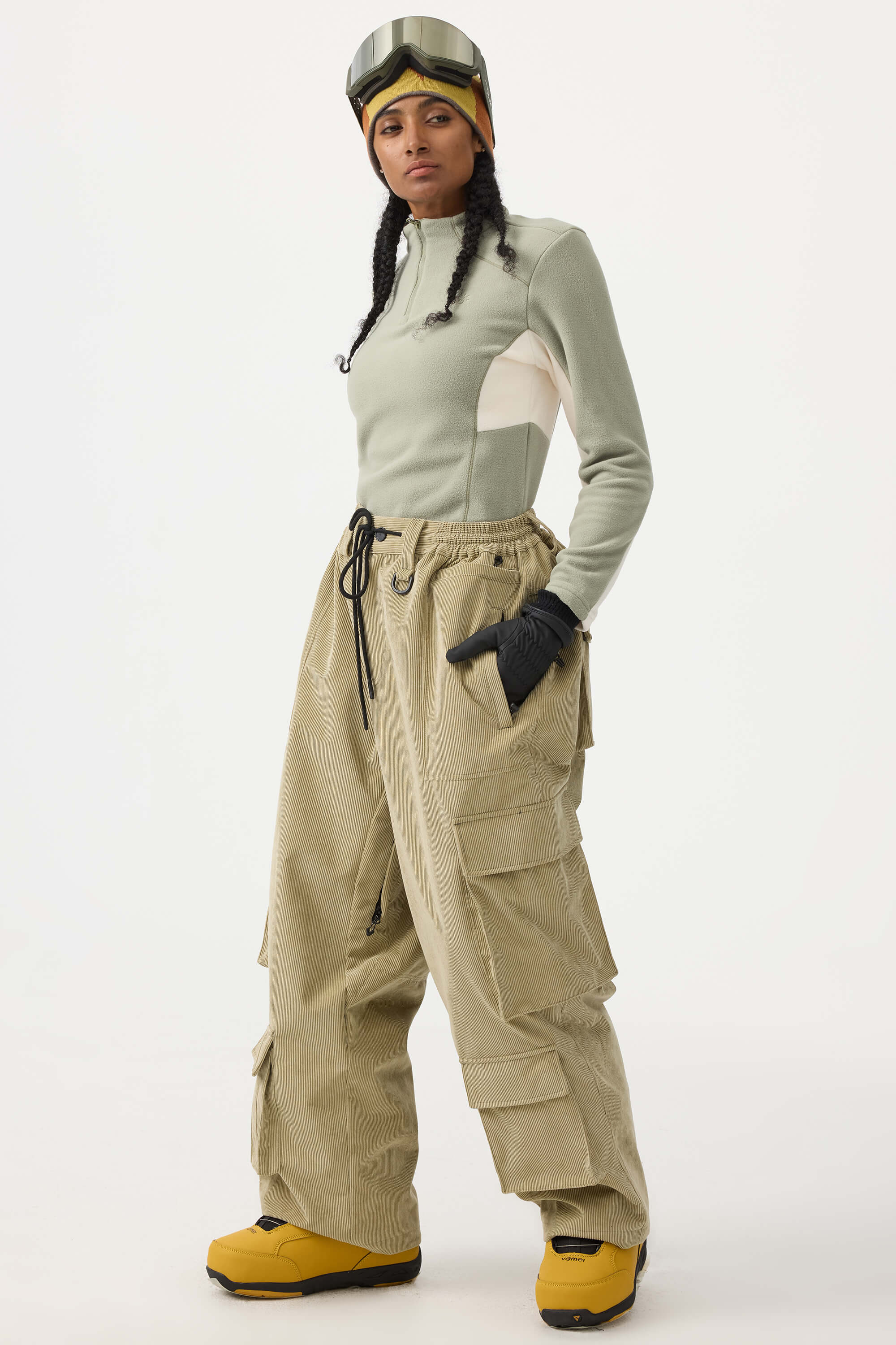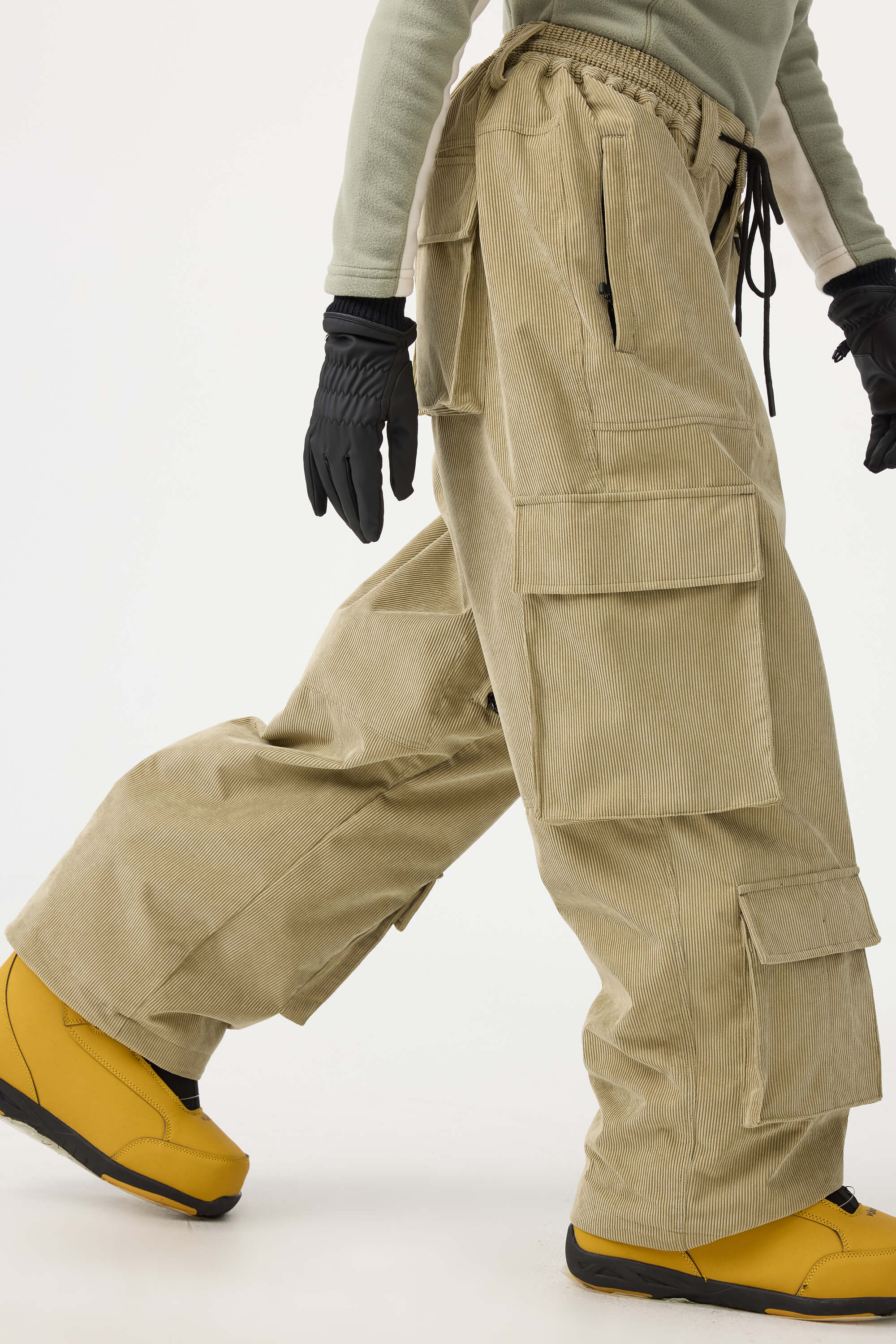 Women's Beige Baggy Multi-Pocket Corduroy Snow Pants